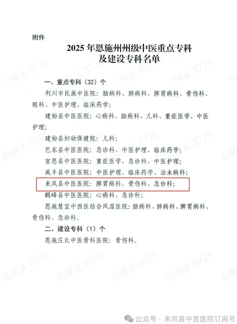 近日,恩施州卫生健康委公布了“恩施州2025年中医重点专科评审名单”我院脾胃病科、骨伤科、急诊科共3个中医专科,被恩施州卫健委评为“十四五恩施州中医重点专科”。